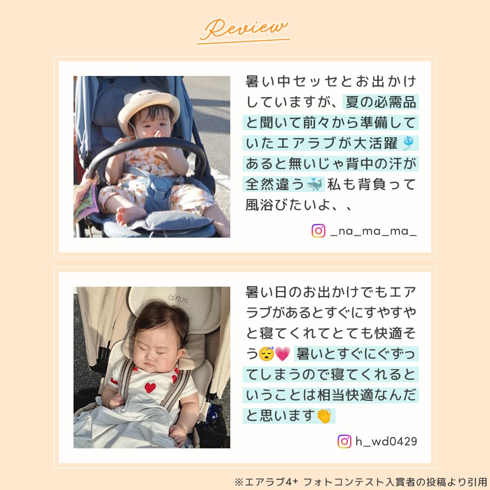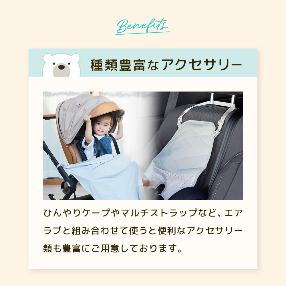 暑い日の必需品!送風機付きクールシートのトップブランド「Airluv(エアラブ)」が、リニューアルして「エアラブ5」に!通気性に優れたダイヤモンドメッシュシートに、お子様の体に合わせた最適な風を送ることにより、真夏のお出かけもさらさら快適に保ちます。